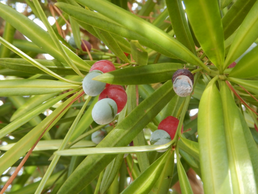 ニ枚目はイヌマキ。プニプニした触感の赤紫の果肉と青緑色の玉がくっついた面白い実です。せせらぎ橋横が見やすいです。