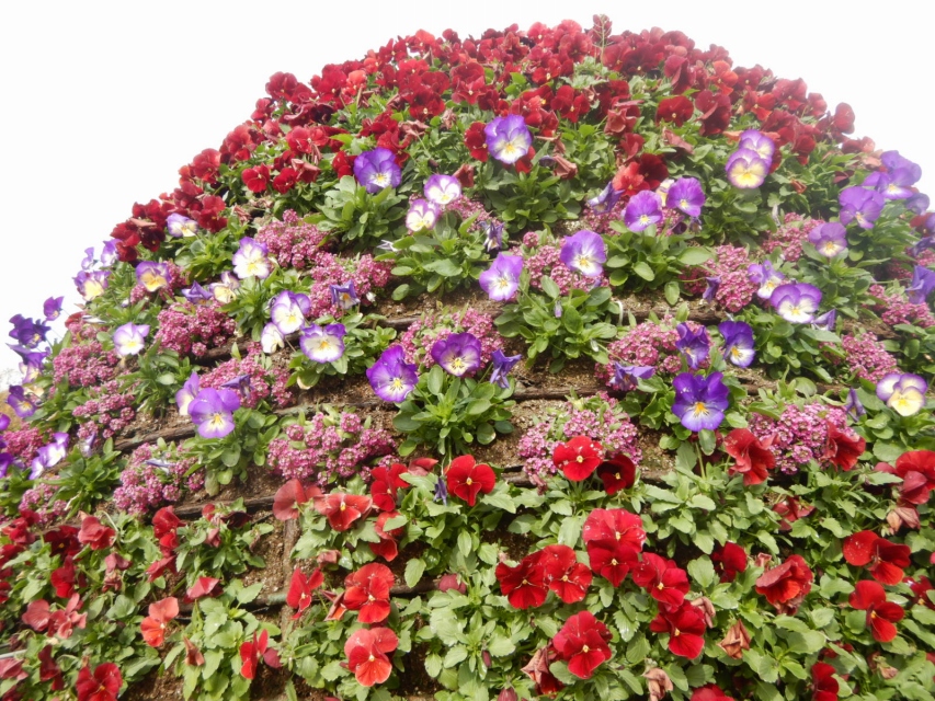 パンジーで飾られた花火鳥とタコトピアリー。小さかった苗が少しずつ大きくなり、花色がだんだんはっきりしてきましたよ。