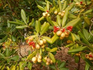 四枚目はトベラ。まん丸い果皮がパカッと3つに割れ、ネットリしたオレンジ色の実が見えます。海見橋周辺の園路沿いに多く植わっています。