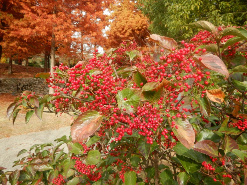 三枚目はハクサンボク。初夏に白いお花を咲かせる木ですが、冬にはびっしりと真っ赤な木の実が付きます。花の谷や、花の丘道の園路沿いで見られます。