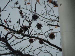 写真一枚目はモミジバフウ。紅葉が終わると、木からブラブラぶら下がるかわいい実が見えてきます。東浦口ゲートそばやポプラの丘などで見られます。