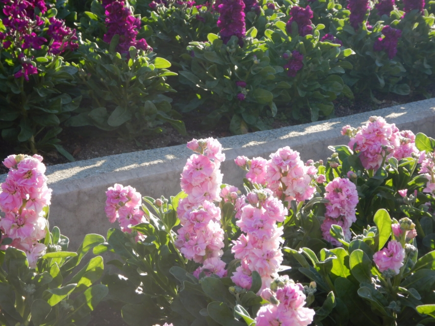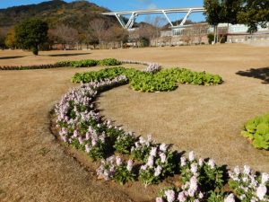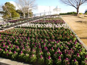 移ろいの庭は1月に入ると寒咲きナノハナが咲き始めますが、それより一歩お先にストックが咲いています。お花の形の花壇の‘茎’部分です。また、移ろいの庭の南西方向にある階段花壇でもストックが成長中です。
