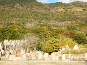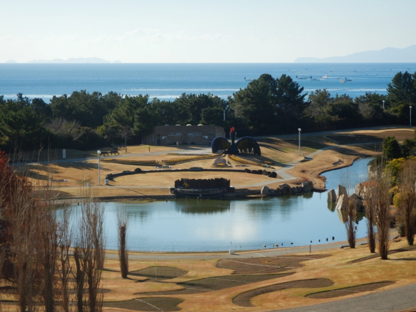 淡路口ゲートから入ったら、①まずは移ろいの庭。ストックとナノハナの様子を見て通り過ぎ、海側の園路を目指します。右手小高いところにはカンツバキが咲いてます。②海沿いの園路を南下し、大地の虹方面へ。立体花壇「アヒル」を右に見つつ立体花壇「花火鳥」へ向かいます。花火鳥は日本最大級の立体花壇ですので、是非記念撮影を。③そこで池をはさんだ西側の山の方向を眺めると、赤いピラカンサが遠目に見えます。④園路沿いに東浦口ゲート方向に向かって見えてくるのが「タコ」の立体花壇。⑤タコを左手に、池を右手に見ながら園路沿いを歩いていきます。この園路沿いは花の丘道と言って、ハーブを主としていろんなお花を植えてあり、‘映え写真’を主目的としない花好きな人に好評な道です。連絡口ゲート方面への曲道へ向かわず、さらにまっすぐ進むと開けた場所が出てきますが、そこはポプラの丘。⑥そこの手前(まっすぐ進む園路と左折する園路の交点)で立ち止まり、左側を見てください。アーコレードという桜が咲いています。その隣にはウォーウィックという桜も。⑦交差点を左折し、月のテラスを目指してゆっくり上ります。右手に四季桜が咲いています(写真一枚目)。そこで左側にグルッと視線を移すと、ヒョロヒョロの木に白い花が見えます。大阪冬桜です(二枚目の真ん中左寄り)。⑧通り過ぎ、右手にフォトリング花壇(木の輪っかがある花壇)が。そのあたりから園路左側にギンヨウアカシア(通称ミモザ)の木が。黄色いつぼみがビッシリついています。⑨フォトリング花壇からちょっと進んだ先には、まっくろくろすけのような実がぶら下がるモミジバフウ(三枚目)、ろうそくの炎のような形の木の実がビッシリ付いたユリノキ(四枚目)がそびえたちます。⑩月のテラスにたどり着いたら海を見ましょう(五枚目)。海を見るならこの時期が一番きれい!⑪月のテラスを通過し、薄暗い道に突入。水の岩戸周辺です。右側はラクウショウの紅葉がまだ残っています(六枚目)。このあたりの園路沿いでアセビのつぼみが見られます。⑫園路が突き当ったら右に曲がります。水の棚田周辺です。ヤツデの花が咲いています。⑬また突き当ったら左に曲がります。時間があれば、左側の花の谷という場所にも花数は少ないですが桜が咲いていますので探してみてください(冬桜、十月桜、子福桜、四季咲伴氏の4品種各1本のみ)。⑭園路を進み、せせらぎ橋を渡り、移ろいの庭階段花壇を見てから淡路口ゲートに。お疲れさまでした。グルッと回って1時間はかからないと思います。