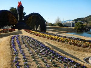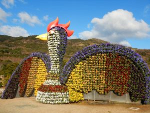 大地の虹にそびえ立つ、パンジーで飾られた花火鳥。今年は虹のようにカラフルです。大地の虹にはこの他に小ぢんまりしたアヒル、東浦口ゲート前にはタコがいますので、是非ご一緒に記念写真をどうぞ。