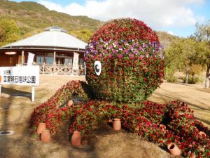 立体花壇「花火鳥」、「タコトピアリー」(場所:大地の虹、東浦口ゲート前)
