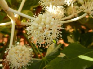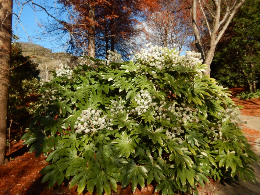 ⑫園路が突き当ったら右に曲がります。水の棚田周辺です。ヤツデの花が咲いています。