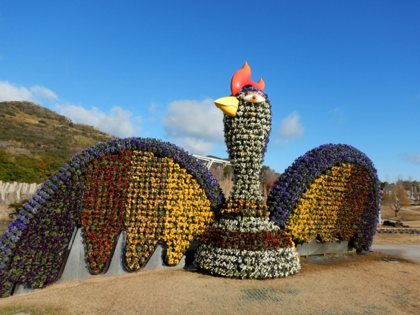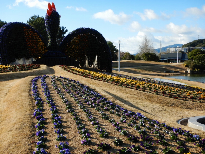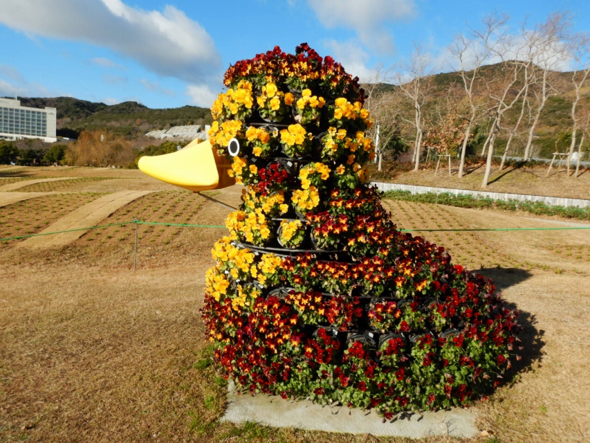 大地の虹にそびえ立つ、パンジーで飾られた花火鳥。今年は虹のようにカラフルです。大地の虹にはこの他に小ぢんまりしたアヒル、東浦口ゲート前にはタコがいますので、是非ご一緒に記念写真をどうぞ。
