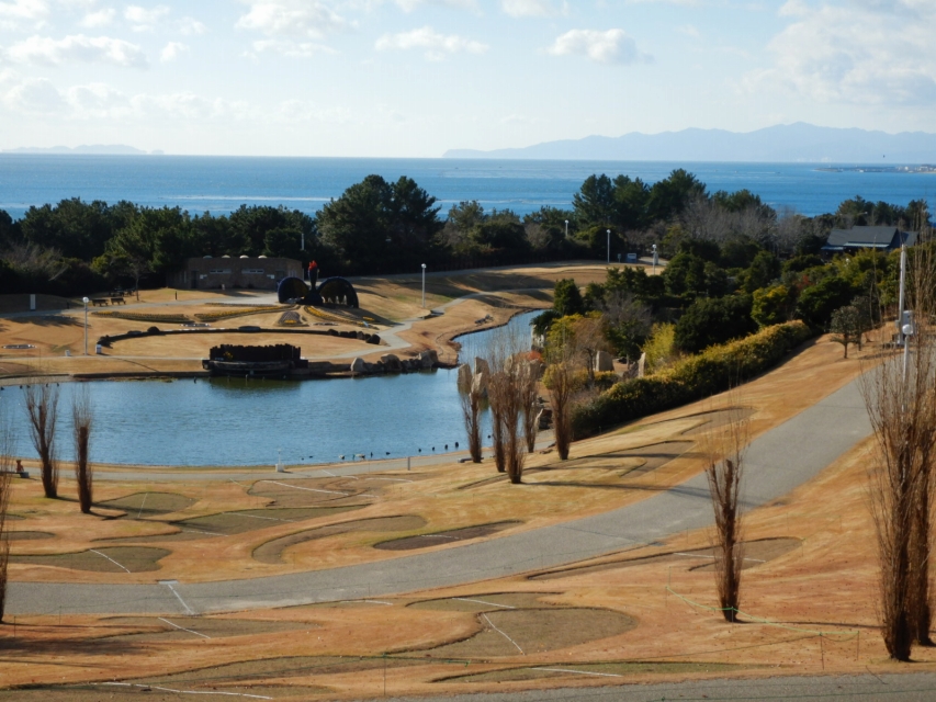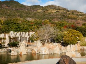 ②海沿いの園路を南下し、大地の虹方面へ。立体花壇「アヒル」を右に見つつ立体花壇「花火鳥」へ向かいます。花火鳥は日本最大級の立体花壇ですので、是非記念撮影を。