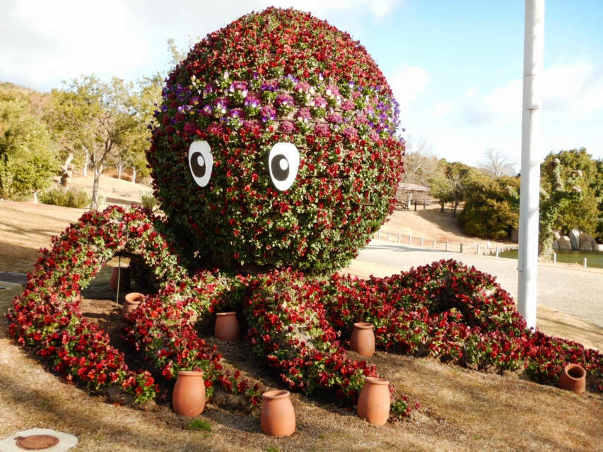 立体花壇「花火鳥」、「タコトピアリー」(場所:大地の虹、東浦口ゲート前)