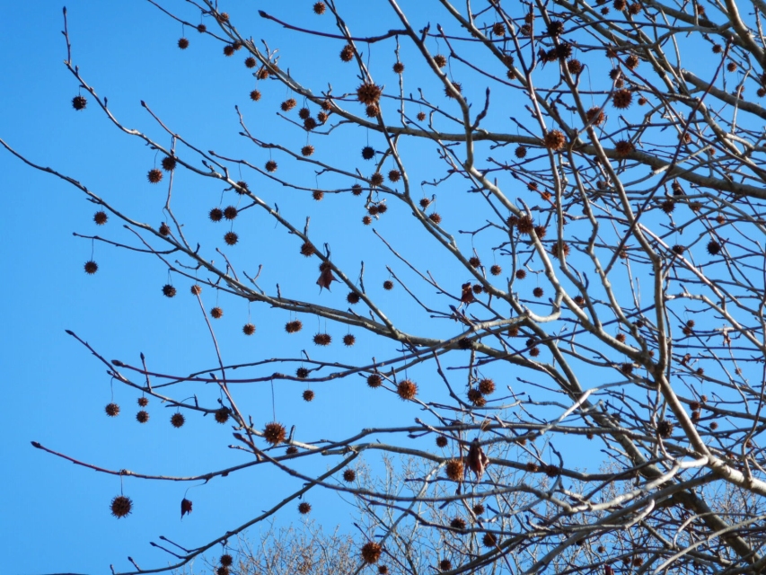 ⑨フォトリング花壇からちょっと進んだ先で上を見上げると、まっくろくろすけのような実がぶら下がるモミジバフウ(写真C)、ろうそくの炎のような形の木の実がビッシリ付いたユリノキ(写真D)が。園路右手側の大きな木です。