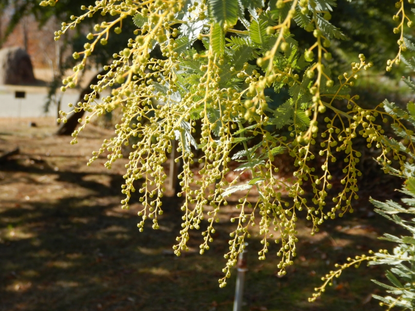 ⑧通り過ぎ、右手にフォトリング花壇(木の輪っかがある花壇)が。そのあたりから園路左側にギンヨウアカシア(通称ミモザ)の木が。黄色いつぼみがビッシリついています。
