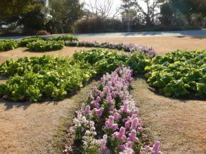 オマケで現在の寒咲きナノハナの様子もご紹介しますね。一通り見て歩いたところ、今日はとうとう咲いた花がありました(写真四枚目)。しかしまだ少数で、9個あるお花形の花壇のうち、両端のお花形に数株といったところです。次回の花情報更新日あたりで、「咲き始め」でご紹介できるかなぁ。。。見ごろになるのは2月初頭くらいでしょうか。