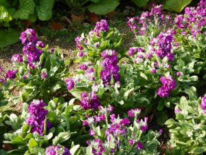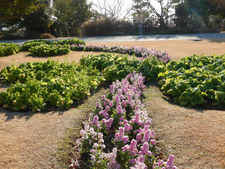 移ろいの庭はもう少しで寒咲きナノハナが咲き始める予定ですが、それより一歩お先にストックが咲いています。また、移ろいの庭の南西方向にある階段花壇でもストックが見ごろです。
