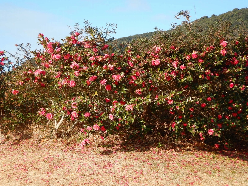 ①まずは移ろいの庭。ストックとナノハナの様子を見て通り過ぎ、海側の園路を目指します。右手小高いところにはカンツバキが咲いてます。
