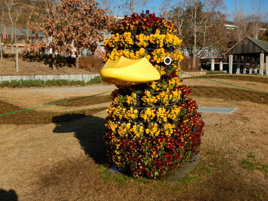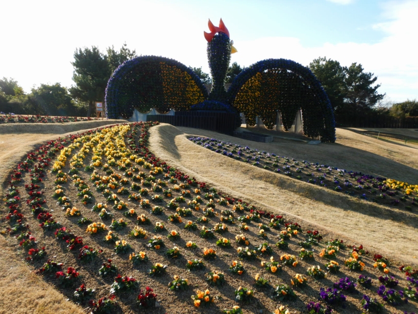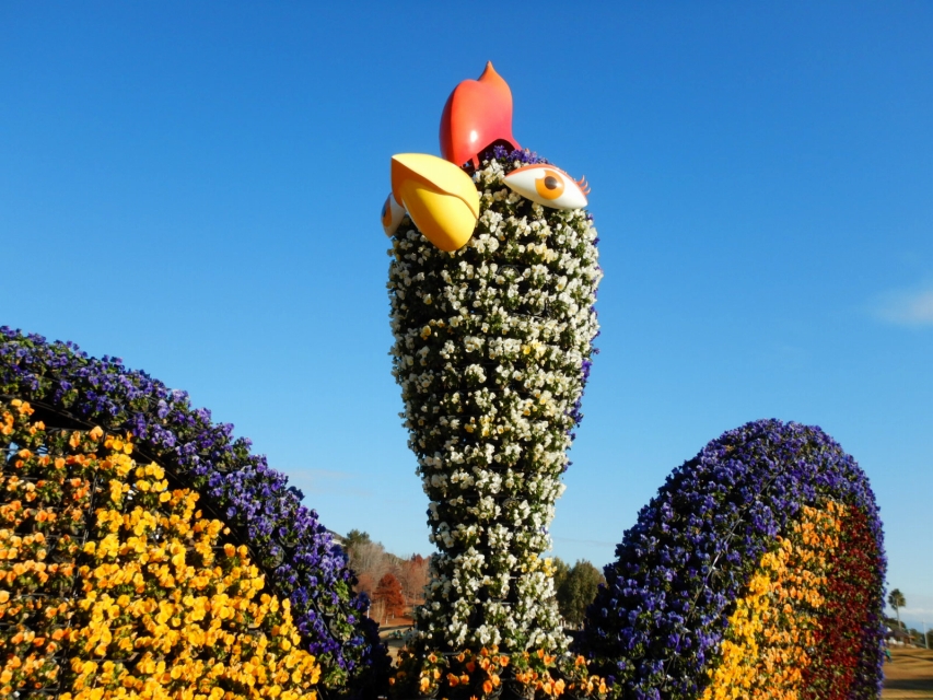 大地の虹にそびえ立つ、パンジーで飾られた花火鳥。今年は虹のようにカラフルです。大地の虹にはこの他に小ぢんまりしたアヒル、東浦口ゲート前にはタコがいますので、是非ご一緒に記念写真を。
