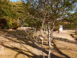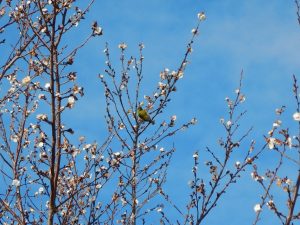 ⑥交差点を左折し、月のテラスを目指してゆっくり上ると、フォトリング花壇が見えてきますが、そのちょっと手前。右手に四季桜が咲いています(写真A)。そこで左側にグルッと視線を移すと、ヒョロヒョロの木に白い花が見えます。大阪冬桜です(写真B)。今日は園内メジロ出現率が高かったのですが、ここでは3羽が花をついばんでいました。写真のど真ん中に1羽写してみました。