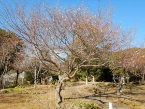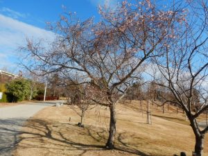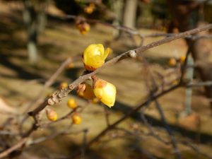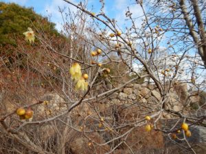 半透明の黄色がきれいなロウバイ。花が楽しめそうな木は、今年は花の谷1本、花の丘道3本。それらのつぼみがほころび始め、甘い香りが楽しめるようになってきました(写真は花の丘道:園内マップだとD5の非常電話近辺)。