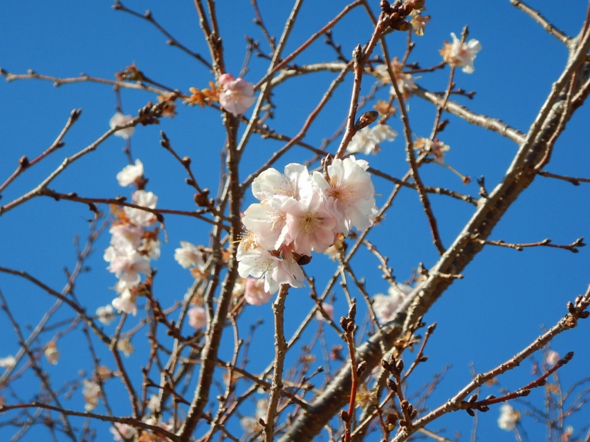 ⑬時間があれば、左側の花の谷という場所にも花数は少ないですが桜が咲いており、写真I,Jは冬桜。それ以外にも十月桜、子福桜、四季咲伴氏が池の周りで各1本チョボチョボと咲いています。