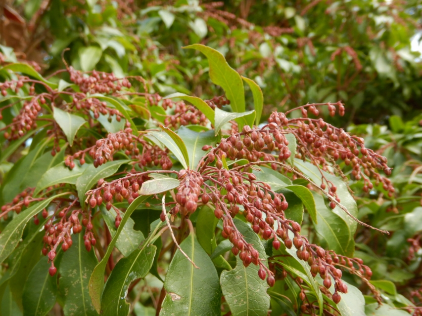 どちらも2月下旬くらいから開花が予想されますが、この時期からちっちゃなつぼみが目に入り始めます。開花するとミモザは黄色いポワポワの花が、アセビは壺形の花が房なりになってどちらもかわいいお花ですが、つぼみの今もかわいいのです。