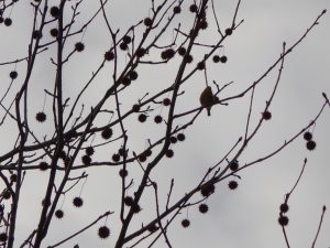 ⑧フォトリング花壇からちょっと進んだ先で上を見上げると、モミジバフウにまっくろくろすけのような形の実が多数ぶら下がっています(写真D)。今日はここでもメジロ発見。実にまぎれて1羽写ってますが、見つけられますか?