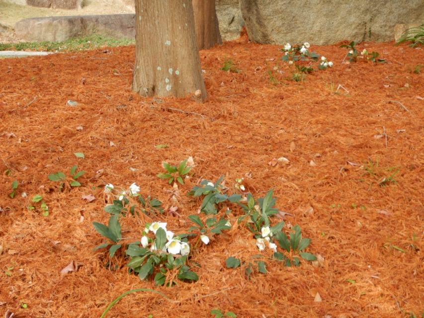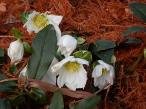 ⑩月のテラスを通過し、薄暗い道に突入。水の岩戸周辺です。このあたりの園路沿いでアセビのつぼみが見られます。また、ヒッソリとクリスマスローズが咲いていたりします(写真E)。よく見ると鳥に齧られてますが(写真F)。