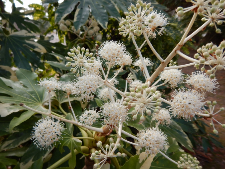 ⑪園路が突き当ったら右に曲がります。水の棚田周辺です。ヤツデの花が咲いています。