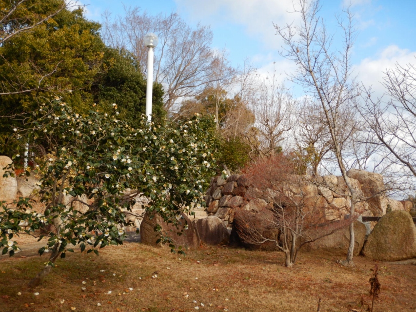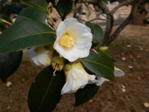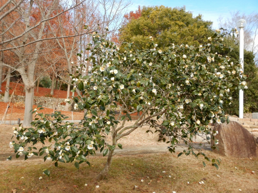 移ろいの庭(写真一・二枚目)や東浦口ゲートそばではカンツバキが咲いています。陽だまりの丘と花の谷の間の園路周辺で、ワビスケ(三・四枚目)やヤブツバキなどがようやく観賞できる程度に咲いてきました。本数的には結構な数のツバキの木があるのですが、開花が遅い木が多いです。