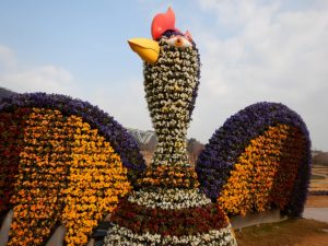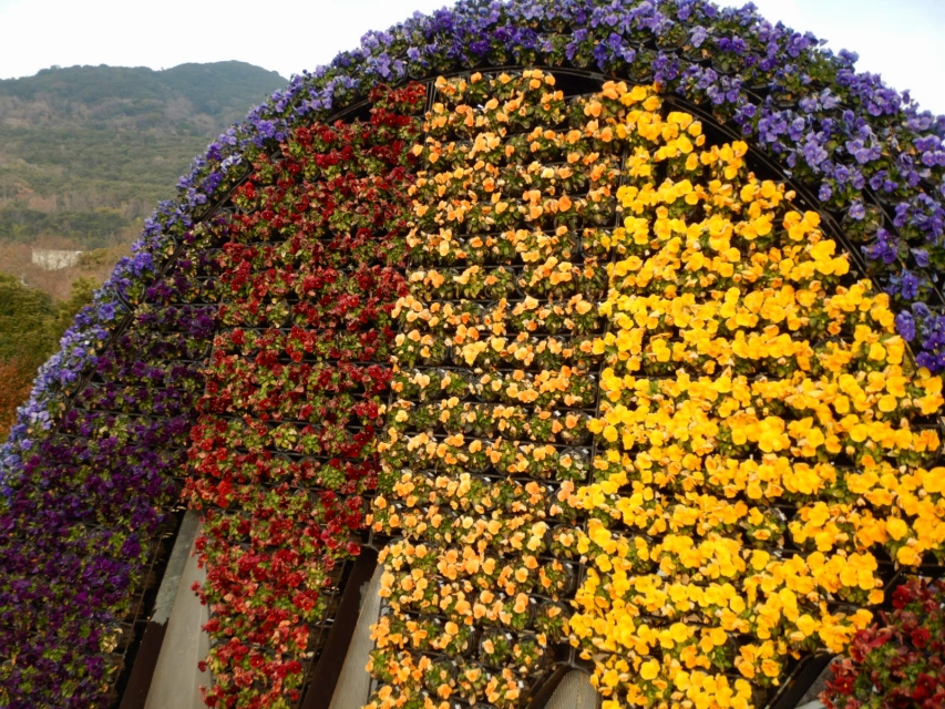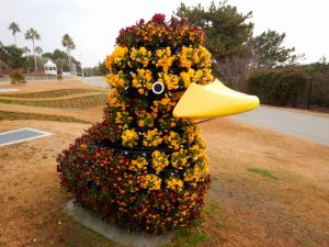 大地の虹にそびえ立つ、パンジーで飾られた花火鳥。今年は虹のようにカラフルです。大地の虹にはこの他に小ぢんまりしたアヒル、東浦口ゲート前にはタコがいますので、是非ご一緒に記念写真を。