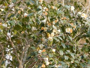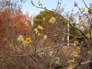 半透明の黄色がきれいなロウバイ。17日時点でつぼみがほころび始めており、今日は満開だろうとウキウキ写真を撮りに行ったところ、木の周囲に点々と黄色い花が…。ショック!花の丘道にある4本のロウバイは一瞬で鳥にやられてしまいました…。そんなわけで今年お楽しみいただける木は、花の谷に1本だけ。今日は満開で、甘い香りが楽しめました。が!ここにも忍び寄るメジロ。写真一枚目の右側の木がロウバイで、左の木は前述の白ワビスケ。このロウバイも次回更新時には花がないかもしれません…。