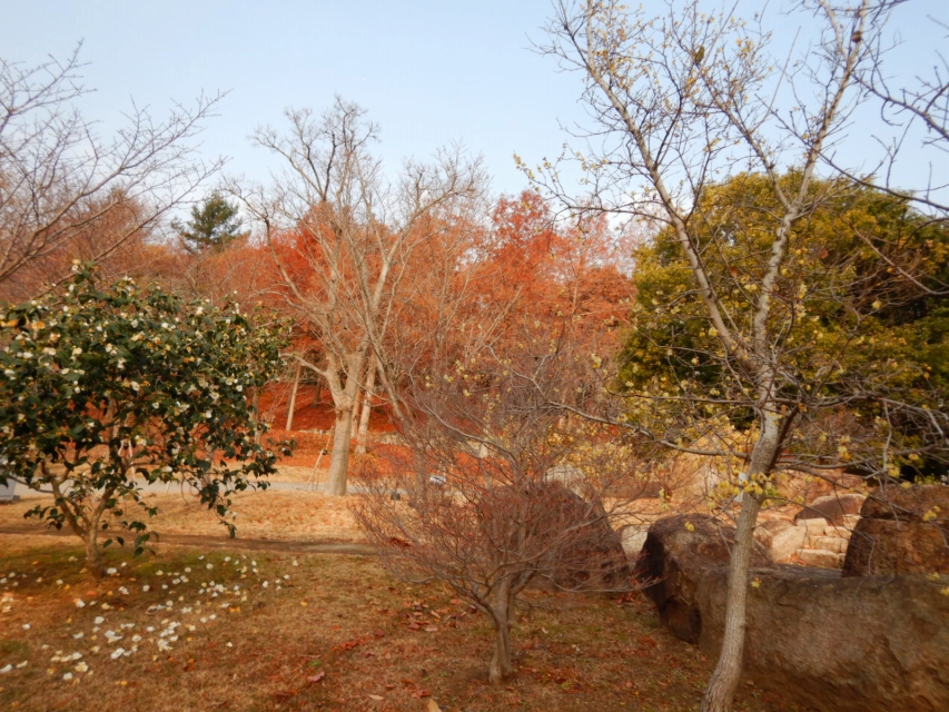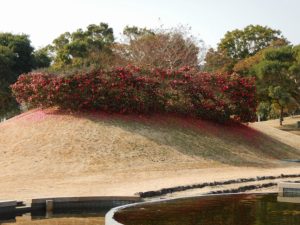 移ろいの庭(写真一・二枚目)や東浦口ゲートそばではカンツバキが咲いています。散った花びらが丘を赤く染めています。陽だまりの丘と花の谷の間の園路周辺には数十本のツバキ類が植えられていますが、開花が遅い木が多く、この時期楽しめる花は数本。その中で今日の注目は白いワビスケ(写真三・四枚目)。先週からようやく観賞できるくらいまで開花したのですが、今日見たら結構散っている!まさかと思ったら案の定、メジロにやられたようです。今日はオマケでウォーリーならぬ『メジロをさがせ!』ゲームを。写真五・六枚目のどこかにメジロがいますよ。探せるかな?(写真をクリックすると大きな写真になります。六枚目は難易度高!)