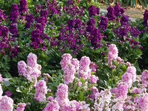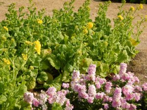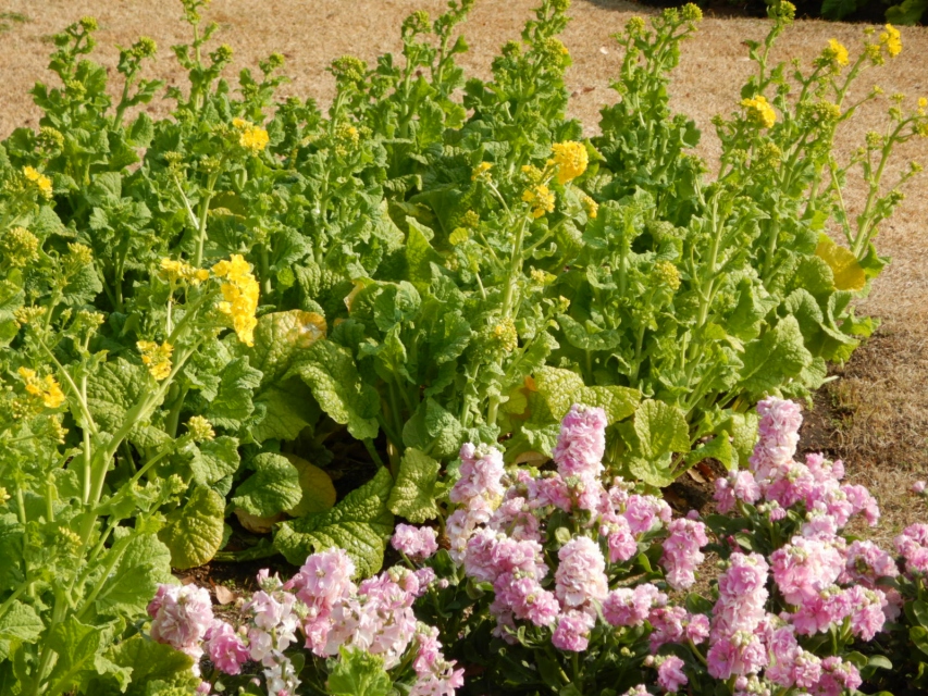 移ろいの庭にあるお花の形の花壇の、お花の‘くき’部分でストックが咲いています。‘お花’部分のナノハナが咲いてきたので(前述)、ストックは脇役になっていきます。移ろいの庭の南西方向にある階段花壇では、2月中旬まで主役を務めます(2月下旬に植替え)。