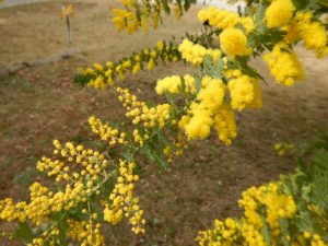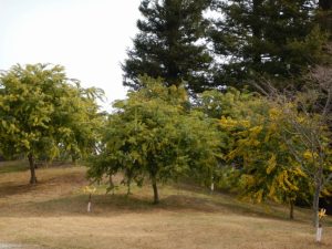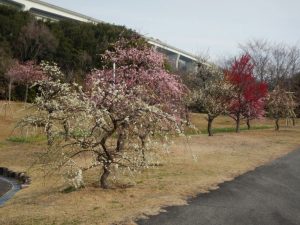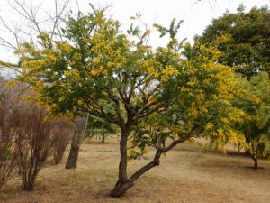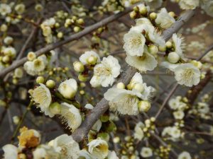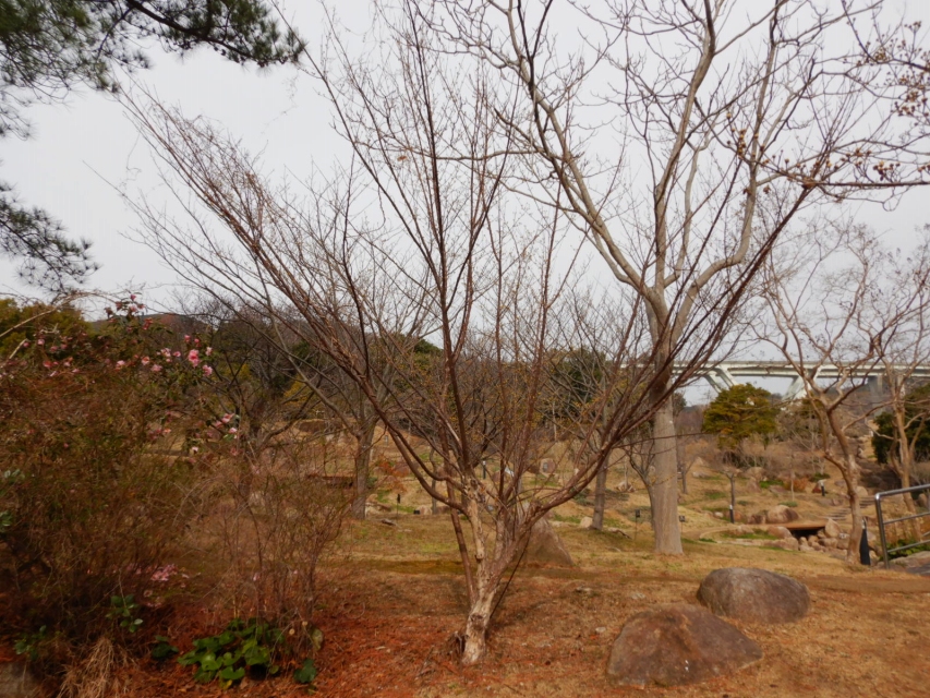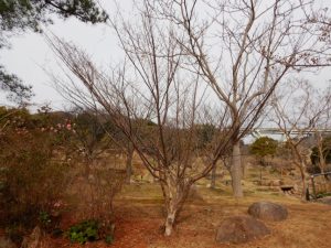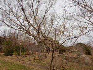 写真一・二枚目:月のテラス周辺(写真二枚目の一番右の木が写真一枚目の木)、三枚目:つぼみと開花が混在の枝、四枚目:花の丘道