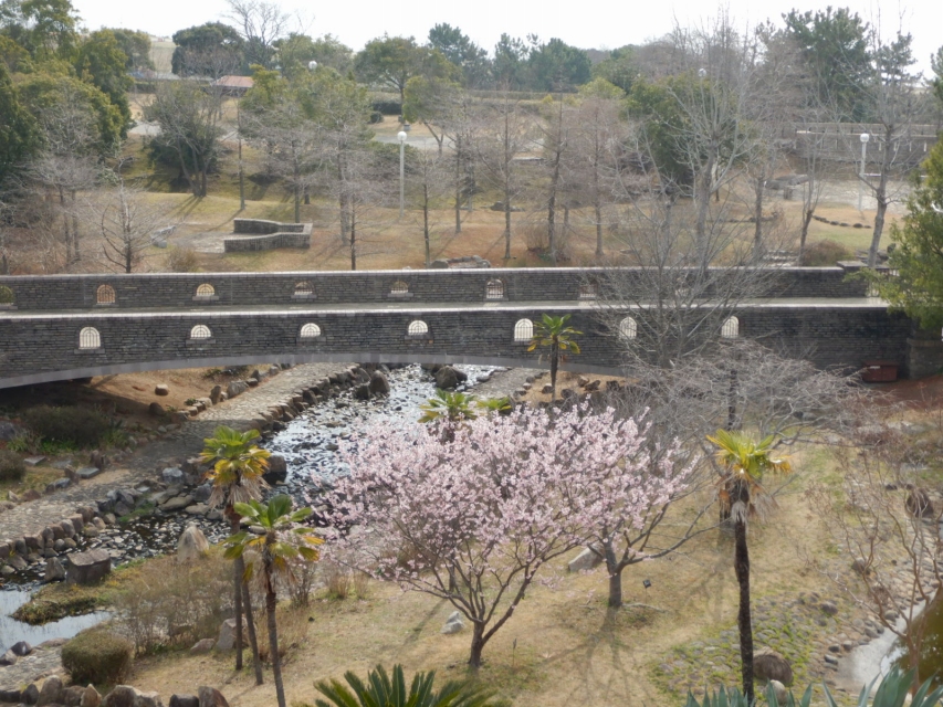 五・六枚目は花の谷(空のテラス下)に咲く初御代桜(ハツミヨザクラ)。せせらぎ橋を渡るときに気づくため、人気の撮影スポットです。でも結構きれいな写真を撮るのは難しいかも。五枚目はせせらぎ橋から空のテラスを眺める方向、六枚目は空のテラスからせせらぎ橋を眺める方向の写真です。