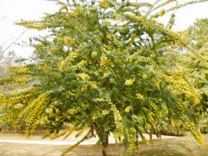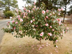 陽だまりの丘と花の谷の間の園路周辺には数十本のツバキ類が植えられておりますが、当公園ではこのくらいの時期から咲き始めるツバキが多いです。例年ですと華やかに咲く河津桜やミモザなどに気を取られて視野に入らないのですが、今年はそれらの開花が遅れていたためお客様に着目いただけ、花は喜んでいるかも。