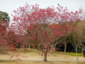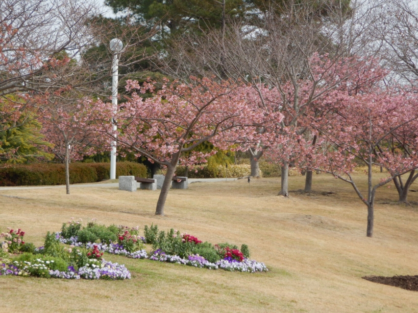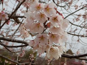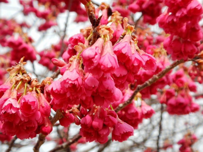写真一・二枚目はポプラの丘上段にそびえる八重寒緋桜(ヤエカンヒザクラ)。曇り空の色にも負けない赤が華やかです。