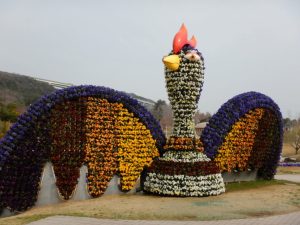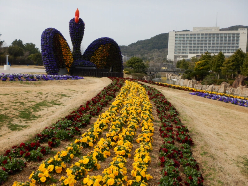 大地の虹にそびえ立つ、パンジーで飾られた花火鳥。今年は虹のようにカラフルです。大地の虹にはこの他に小ぢんまりしたアヒル、東浦口ゲート前にはタコがいますので、是非ご一緒に記念写真をどうぞ。