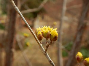サンシュユは数ミリのお花が30ツブくらい集まって、ポワワワ~っとしたひとかたまりになります。今日は数ツブのお花の開花が確認できました。咲き進むと木全体に黄色いかたまりが付き、なかなか見事になるのです。お楽しみに。