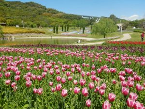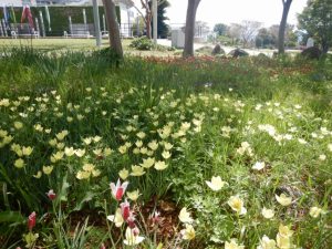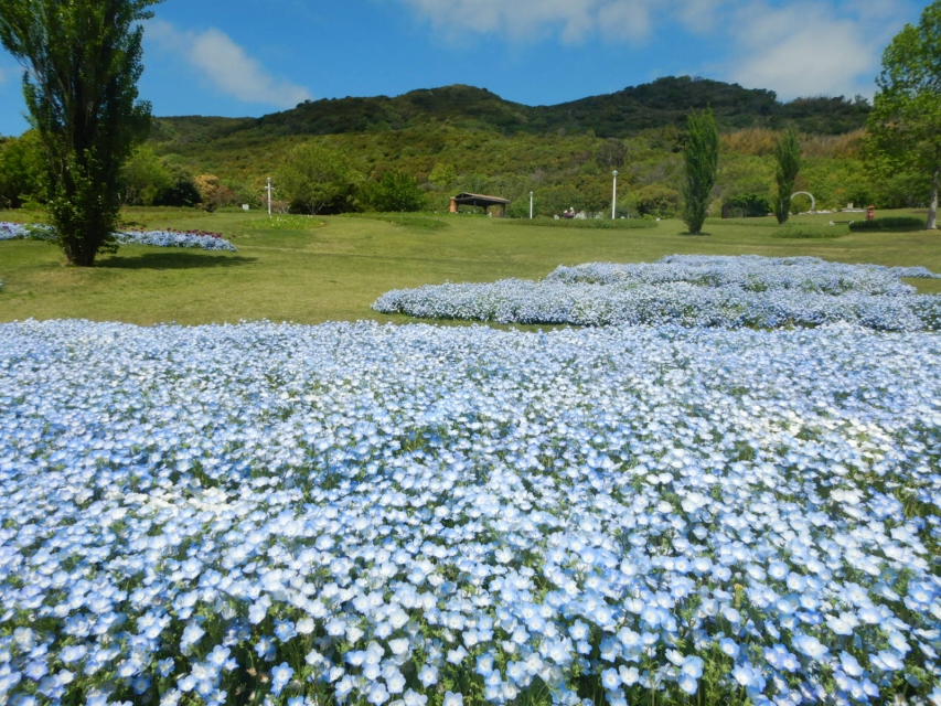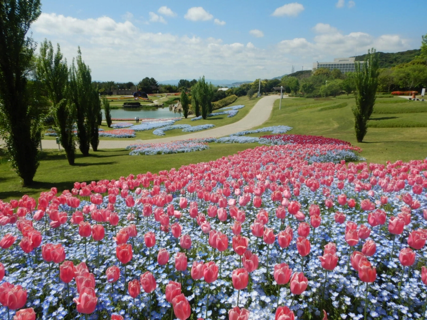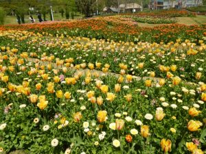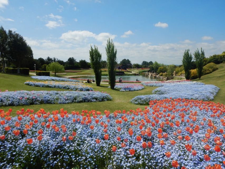 チューリップが残っている場所もありますが、ほぼ水色一色になっています。ネモフィラだけのブルーの花壇も人気ですが、チューリップ一緒に咲いている状態もとてもかわいいので、是非ご覧いただきたいです!