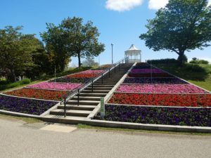 移ろいの庭の花壇は、お花の形をしています。ペチュニアの花数が多くなり、花壇の形がクッキリとしました。階段花壇も鮮やかで、集合写真撮影の背景にされる方が多いです。