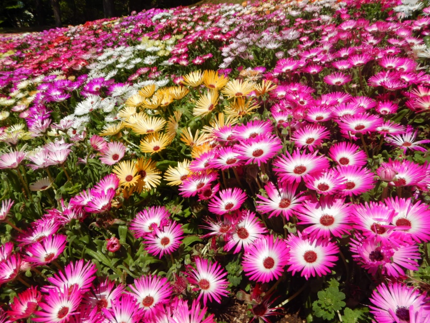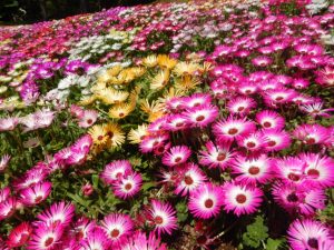 太陽の光で開花するリビングストンデージー。日の当たる時間(11時~14時くらいがベスト)にいらしていただけると、きれいなお花をご覧いただけます。