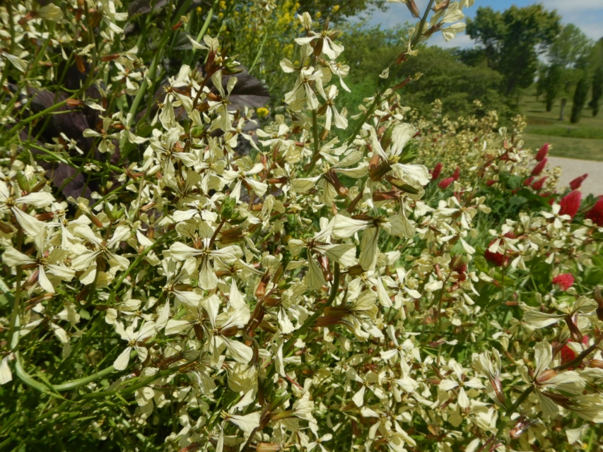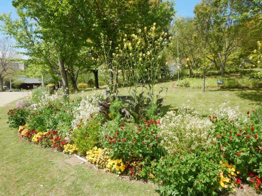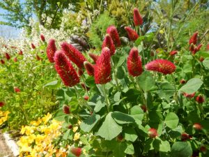 東浦口ゲートからポプラの丘までの園路沿いで、にいろいろなハーブや草花でとても賑やかになっています。三枚目の写真は真っ赤な花と大きな三つ葉が特徴のクリムゾンクローバー、四枚目の淡い黄色のお花は料理でも使われるルッコラです。