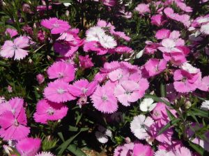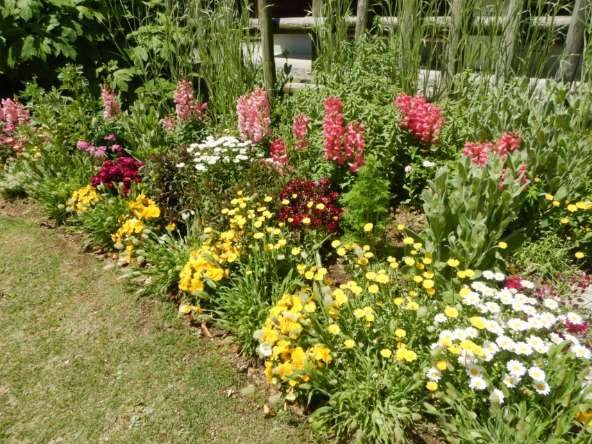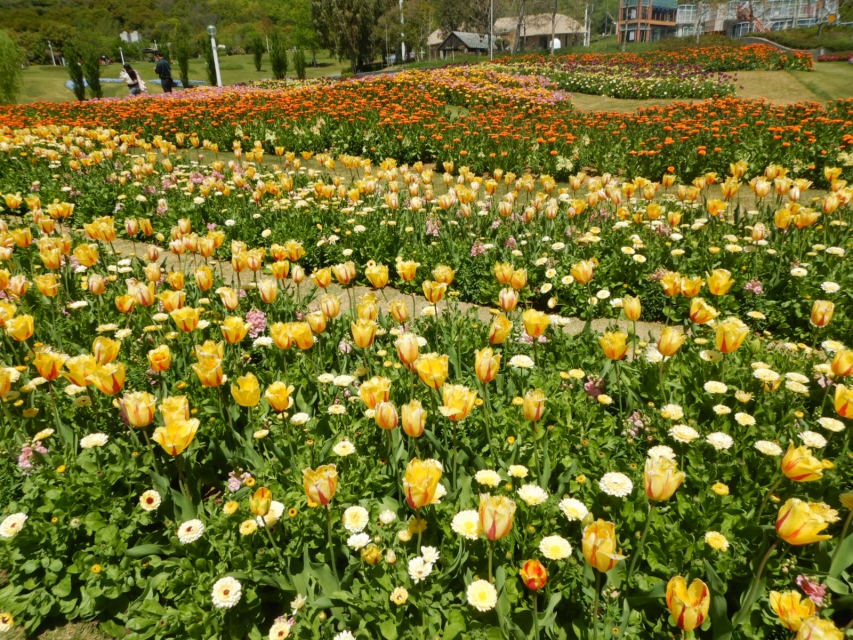 ネモフィラと同じくチューリップと一緒に咲いていて、橙・黄色のほかクリーム色のかわいいキンセンカ(写真一枚目)や、ピンクのグラデーションみたいなかわいいナデシコも見ごろです。その他周囲では、キンギョソウやジギタリスなども開花が始まっています。