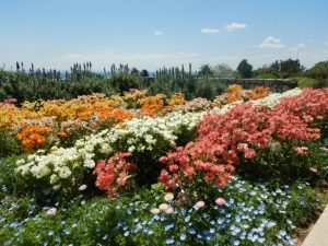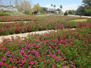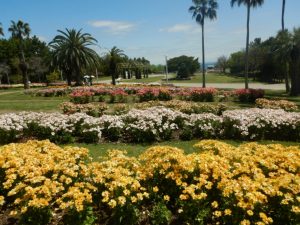 写真一枚目:パームガーデン、二枚目:海のテラス周辺、三枚目:お花のアップ、四枚目:花の丘道