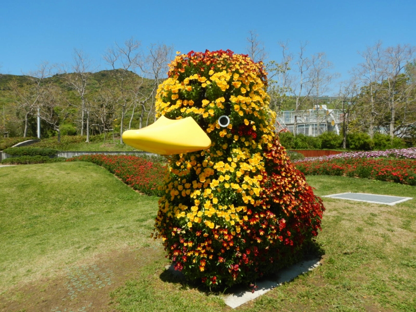 大地の虹にそびえ立つ、パンジーで飾られた花火鳥。立体部分を見て満足されるとは思いますが、じつは花火鳥の尾っぽ部分のパンジーもきれいに咲いているんですよ。今と~っても状態ヨシ!大地の虹には花火鳥の他に小ぢんまりしたアヒルもいます。