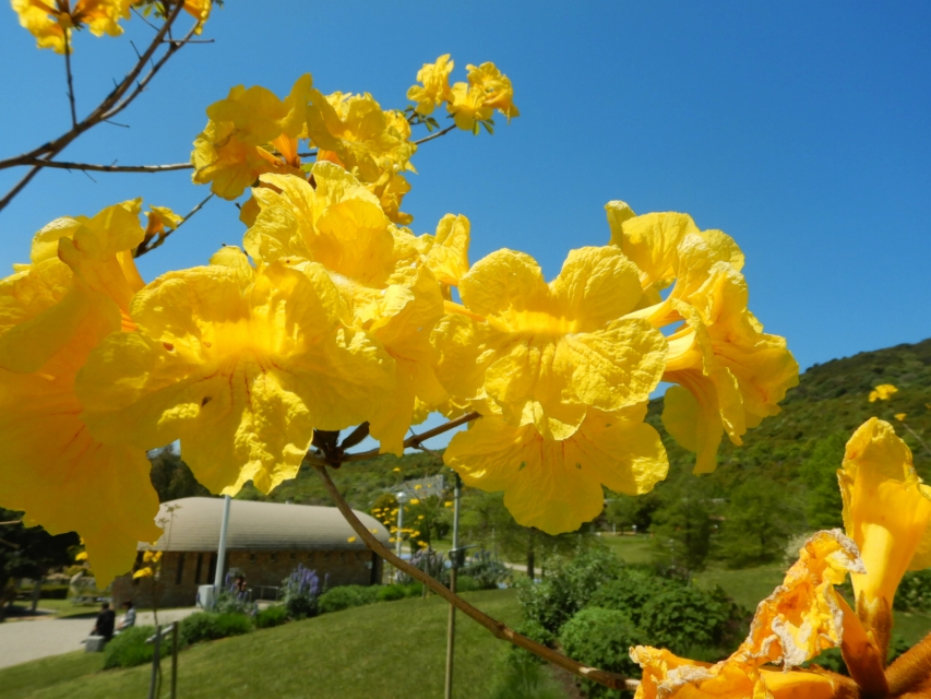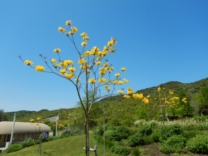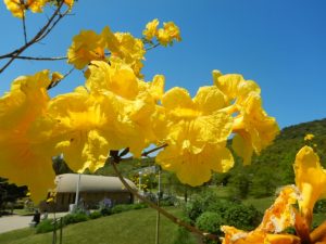 大きなラッパみたいな黄色のお花が青空にくっきりと目立っています。
