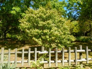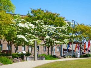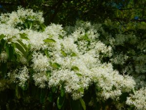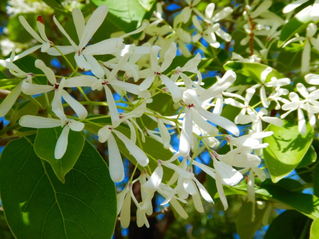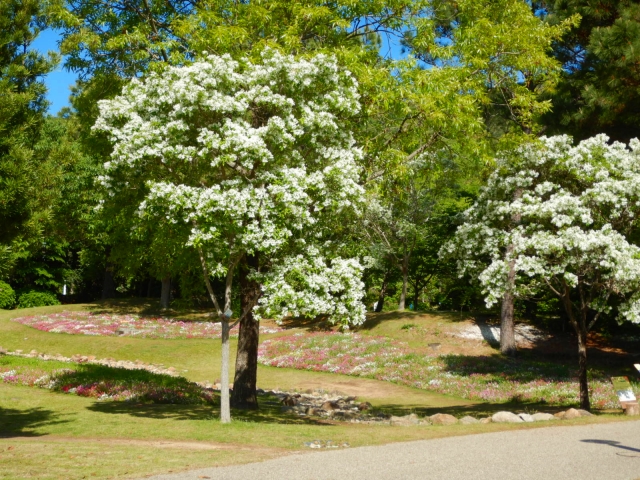 今、園内に粉砂糖を振りかけたような木が見られますよ。爽やかな感じが漂っているので、気付いたら寄っていきたくなるのではないでしょうか。近くで見てみると、白いお花状の部分は十字のプロペラみたいな形をしています。まぁパッと見るとケーキに乗ってるココナツ粉やそうめんの切れっぱしみたいに見えるんですけどね。