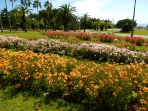 写真一・二枚目:パームガーデン、三枚目:海のテラス周辺、四枚目:お花のアップ