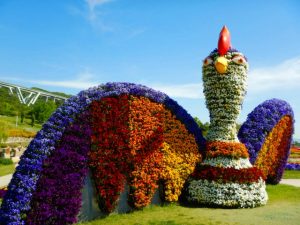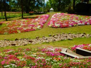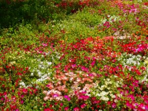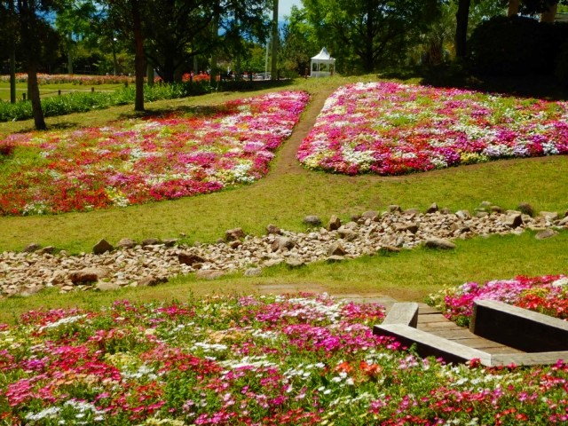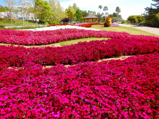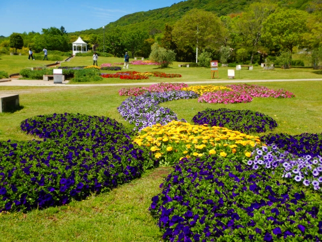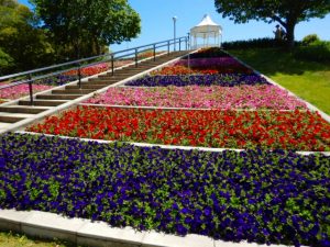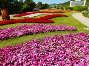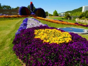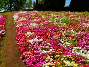 移ろいの庭の花壇はお花の形をしており、でっかい花びらや茎をペチュニアで塗りつぶしている感じです。階段花壇も鮮やかで、写真撮影にはおススメですよ。