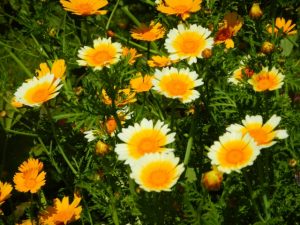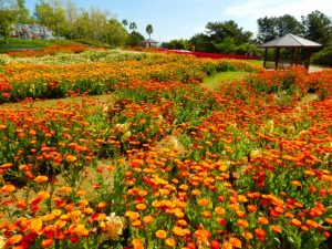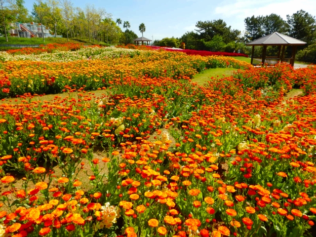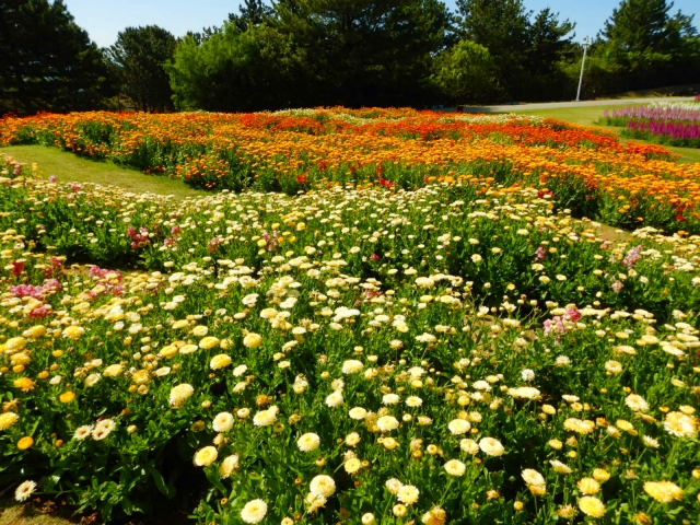 ナデシコもミッチリ花が開花していて、寝っ転がりたくなるフカフカカーペット感が満載です。黄色やオレンジのキンセンカも元気いっぱい咲いています。