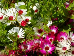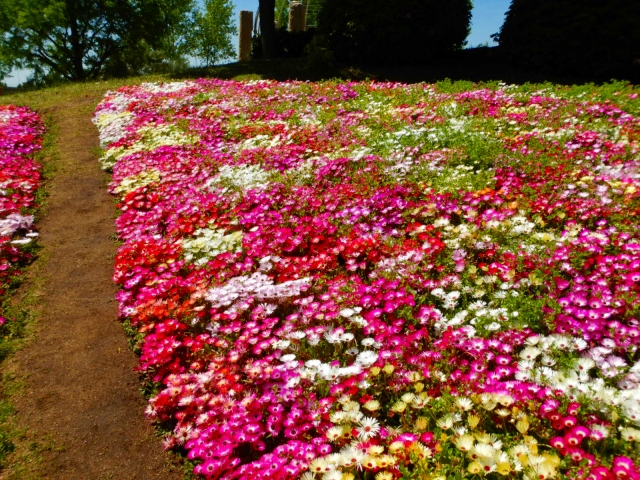 太陽の光で開花するリビングストンデージー。晴れの日の、日の当たる時間(11時~14時くらいがベスト)にいらしてください。